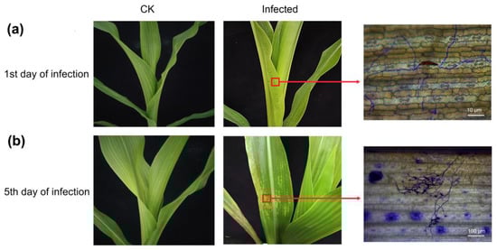 Compared to the uninfected control group, disease symptoms, especially lesions, gradually appeared on maize leaves inoculated with B. maydis spores. After infection, symptom manifestation started with the appearance of light-gray translucent water stains on the leaves, accompanied by chlorosis on day 1 (Figure 1a). On day 5, the spots spread rapidly and fused into larger yellowish-brown irregular lesions on the leaves (Figure 1b). Microscopy observation of the infected leaves after trypan blue staining revealed that, on day 1 after infection, conidia of the pathogen began to germinate on the leaves and growing hyphae began to spread. On day 5, dense hyphae proliferated, and oval sporangia gradually appeared on the top of some hyphae (as shown by the arrows).