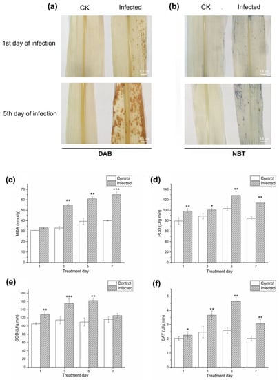 Detection of reactive oxygen species (ROS) accumulation by (a) DAB and (b) NBT staining in maize leaves and physiological investigation in response to Bipolaris maydis infection, including (c) MDA content, (d) POD activity, (e) SOD activity, and (f) CAT activity. (Student’s t-test, * p < 0.05; ** p < 0.01; *** p < 0.001.).