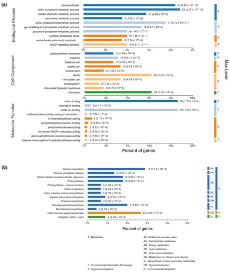 Enrichment analysis of differentially expressed genes (DEGs). (a) The results are summarized in three main categories: biological process; cellular component; and molecular function. The x-axis indicates the number and percent of genes in each category. The y-axis indicates the most enriched GO terms in the three main categories. Max level indicates maximal annotated level of the term in the GO graph. (b) KEGG enrichment analysis of 2146 DEGs. The x-axis indicates the percent of genes, and the y-axis indicates pathway.