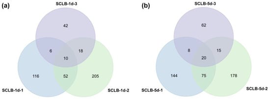Venn diagrams showing the numbers of differentially expressed peptides (DEPs). (a) Overlap of DEPs between SCLB-1d-1, SCLB-1d-2, and SCLB-1d-3. (b) Overlap of DEPs between SCLB-5d-1, SCLB-5d-2, and SCLB-5d-3.