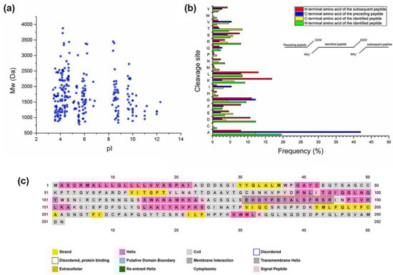 (a) Scatter plot of molecular weight (Mw) versus isoelectric point (pI) distribution of common differentially expressed peptides (DEPs); (b) histogram showing the cleavage sites of N-terminal and C-terminal amino acid of the preceding and identified peptides; and (c) prediction of the secondary structure of precursor protein (B6SSH9) of peptides.