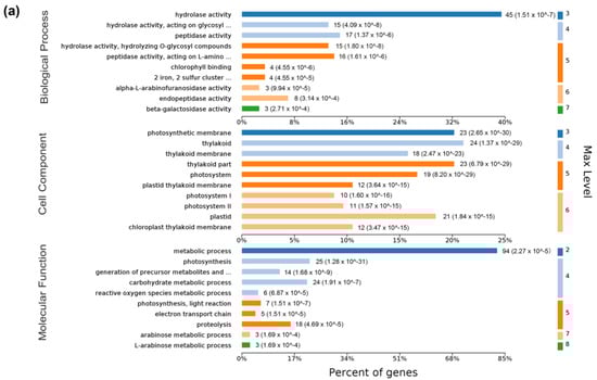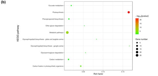 Analysis of the 262 DEPs’ precursor proteins showed that they belong to 147 non-repetitive proteins. GO and pathway enrichment analysis of their precursor proteins suggested that 236 DEPs might have biological events (Figure 7a). GO analysis showed that the main biological process categories were hydrolase activity, peptidase activity, and peptidase activity acting on L-amino acid peptides. The main cellular components involved were thylakoid, thylakoid part, photosynthetic membrane, and plastid. The molecular function levels were mainly related to the metabolic process, photosynthesis, and carbohydrate metabolic process. Enrichment of the KEGG pathway involved two major pathways, namely the photosynthesis and metabolic pathways, accompanied by other pathways, including carbon fixation in photosynthetic organisms, carbon metabolism, phenylpropanoid biosynthesis, pyruvate metabolism, glycosphingolipid biosynthesis in ganglio series and in globo and isoglobo series (Figure 7b).