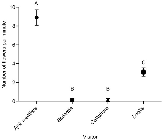 Figure 1. Number (mean ± SE) of flowers visited per minute by various insects on Pyracantha angustifolia in the grassland biome, Free State Province. Different letters indicate statistical significance (H-value = 62.68, p < 0.001, df = 3, Kruskal–Wallis).