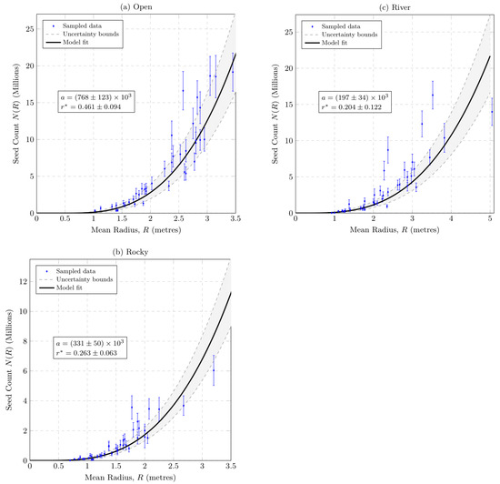 For each of the three sites (river, open, and rocky), seed count samples were recorded, as well as tree size and density in five 25 m2 quadrats. From the data it was possible to calculate the seed density, n (in millions of seeds per square meter of P. angustifolia invasion), for each of sites (Figure S4). Effectively, this is how many seeds are entering the environment per meter of invasion for each of the three sites. The probability distributions of seed density followed an exponential probability distribution function of the form