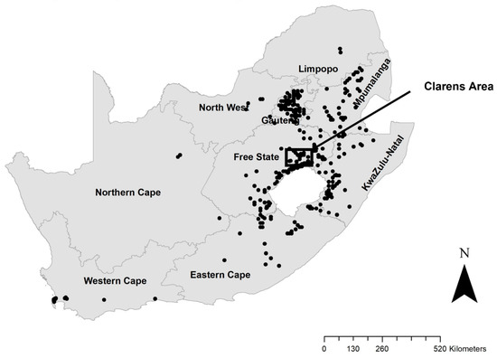 The data were collected in the eastern Free State Province of South Africa (Figure 3) from April 2018 to June 2020. The study area is typified by private farmland with patches of natural grassland, rocky outcrops, and sandstone cliffs deeply incised by rivers [61]. The area receives an average rainfall of 600 to 1000 mm per annum, and occasional snow and frequent frost in winter. The annual average minimum and maximum temperatures are 6 °C and 26 °C, respectively, although frost usually reduces the temperature to well below freezing in winter [62]. The area falls under the grassland biome (Mesic Highveld Grassland) [61]. More specifically; the Eastern Free State Clay Grassland and Eastern Free State Sandy Grassland, which are now mostly transformed by the agricultural industry [61].