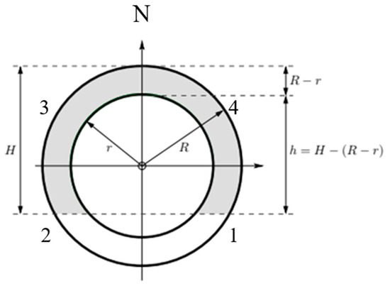 Figure 4. Shrub’s cross-sectional view assuming an approximate spherical shape of the shrub indicating the effective fruiting distance, Rr, (shaded) and fruiting height, h). The numbers around the shrub indicate the quadrants (numbers 1 to 4). H refers to the fruiting height of the plant.