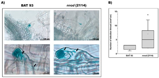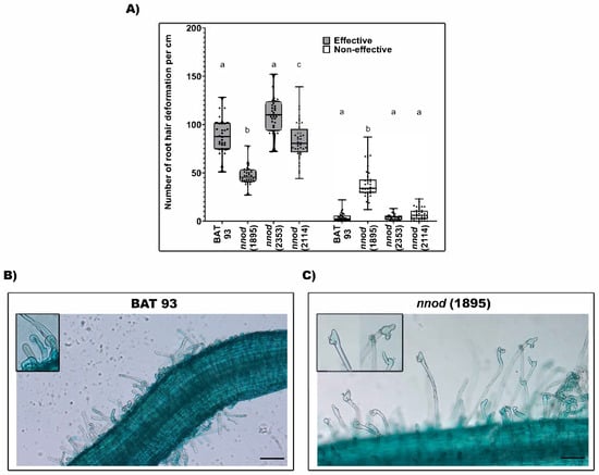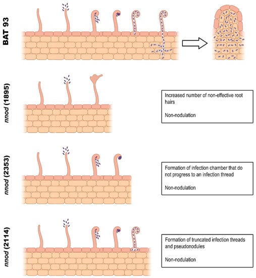 2.3. Comparative Microscopical Analysis of Inoculated BAT 93 and Nnod Mutants’ Inoculated Roots at the Early Stages of the Symbiotic Process