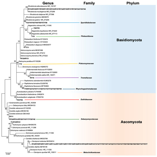 For phyllosphere yeast communities, 10 g of leaves from each plant were shaken into flasks with 90 mL of sterile distilled water on a rotary shaker (Inch Incubated Shaker, BEING Scientific Inc., Ontario, CA, USA, BIS-3, 230 V) for 30 min; the solution was collected, and serial dilutions were made to 10−3 and spread on a YPDA medium (g/L; 10 yeast extract, 20 peptones, 20 D-glucose, 20 agar, 10% tartaric acid (w/v), pH 4.0). Endophytes were isolated according to the suggestion of [29,64], although slight modifications were made to these. Ten grams of leaves, roots or kernels were surface-sterilized by immersion in 70% ethanol for 30 s and then in 4% sodium hypochlorite solution for 6 min. Plant tissues were then crushed in a sterile blender (Classic Blender Model, Oster, Boca Raton, FL, USA) with 90 mL of sterile distilled water for 5 min, and serial dilutions up to 10−3 were spread on a YPDA medium. All plates were incubated at 28 °C for 5 days. Yeast colonies were selected based on morphological differences and purified on a YPDA medium. The purified strains were preserved in microtubes with 30% glycerol at −80 °C.