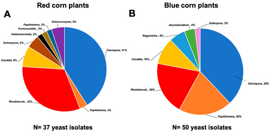 Yeast diversity associated with the Mexican maize landrace “Raza cónico.” (A) Relative abundance of yeast genera isolated from plants of red corn (37 isolates) and (B) blue corn varieties (50 isolates).