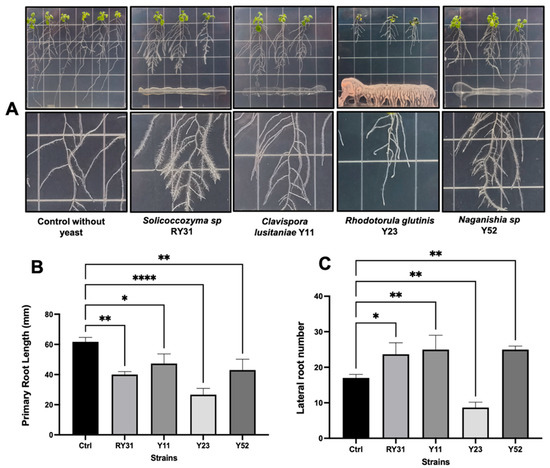 Effect of auxin-producing yeasts on growth and root architecture of Arabidopsis thaliana col-0. (A) Development of A. thaliana seedlings and lateral root production at 7-day post inoculation with yeasts in Murashige and Skoog plates. (B) Comparisons of primary root size and (C) number of lateral roots between non-inoculated plants and yeast treatments. Statistically significant differences are denoted with asterisks according to Dunnett’s test, with values of p < 0.05 (*), p < 0.01 (**), and p < 0.0001 (****).