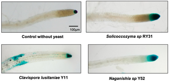 To understand whether the positive effects of yeast were mediated by auxin production, we used the A. thaliana DR5:uidA line, which is an efficient IAA biosensor. It has TGTCTC motifs commonly found in the promoters of auxin-inducible genes [58]. The roots of R. glutinis Y23 were not included because plants showed deficiencies during their development, as explained above. Histochemical analysis showed β-glucuronidase activity in the lateral roots of A. thaliana in co-culture with Solicoccozyma sp. RY31, C. lusitaniae Y11, and Naganishia sp. Y52 (Figure 4). This supports that the auxins produced by yeasts were responsible for the changes in the root structure.