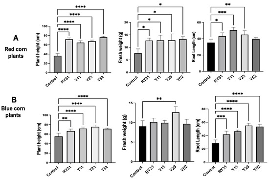 Effect of auxin-producing yeast inoculation on maize growth. (A) Morphological parameters of 30-day-old maize plants of red and (B) blue varieties. Statistically significant differences are denoted with asterisks according to Dunnett’s test, with values of p < 0.05 (*), p < 0.01 (**), p < 0.001 (***), and p < 0.0001 (****). The inoculated strains were Solicoccozyma sp. RY31, Clavispora lusitaniae Y11, Rhodotorula glutinis Y23, and Naganishia sp. Y52. Controls were non-inoculated plants.