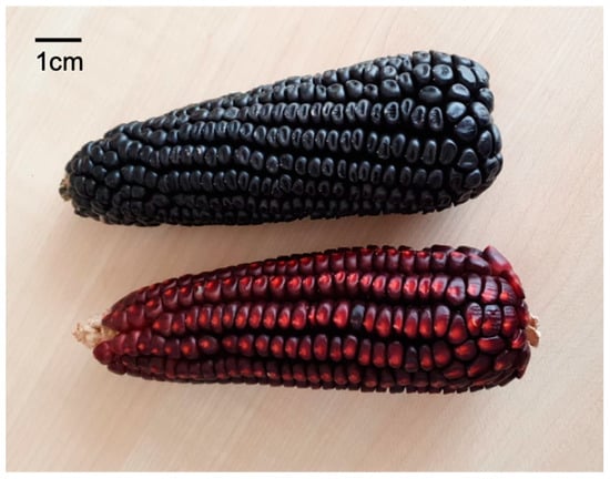During the 2017–2018 crop cycle, plants of the Mexican maize landrace “Raza Cónico” (Figure 6) were collected from an agricultural field in the locality of “La Paila, Tezoncualpa” in the state of Hidalgo, Mexico (20°31′41.9″ N, 98°43′17.7″ W). This landrace has high emergence vigor and cold tolerance with a predominant distribution in temperate areas between 1800 and 3000 m above sea level [63]. Leaf, root, and grain samples were taken from plants (R4 stage) with no chlorosis, necrosis, or parasite infestation and stored in polystyrene bags at 4 °C until they were analyzed. Twelve plants of each variety were sampled.