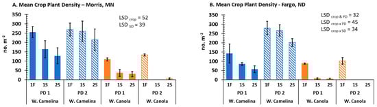 Crop (C) and Sampling Date (SD) were significant (p ≤ 0.05) for crop plant counts at both locations, while Planting Date (PD), and C × PD, and C × SD interactions were significant factors at the Fargo but not the Morris field site (Table 1). For weed counts and dry matter biomass, only PD was significant for biomass in Fargo, while the Crop × PD interaction for dry matter was significant in Morris (Table 2).