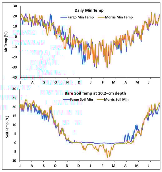 Comparison of minimum average daily air and soil temperatures (at 10.2−cm depth) from July 2019 through June 2020 in Fargo, ND (https://ndawn.ndsu.nodak.edu, accessed on 31 January 2023) and Morris, MN (https://www.ars.usda.gov/midwest-area/morris-mn/soil-management-research/docs/weather/, accessed on 31 January 2023).