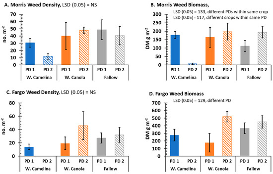 Weed density in crop [winter camelina, winter canola/rapeseed (W. Canola)] vs. fallow weed density (A,C) or weed dry matter (DM) biomass in crop [winter camelina, winter canola/rapeseed (W. Canola)] vs. fallow weed DM biomass (B,D) at Morris, MN (A,B) and Fargo, ND (C,D) based on crop planting date 1 (PD1 = late August 2019) or PD2 (mid−September 2019). Bars represent the mean ± S.E.
