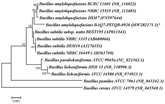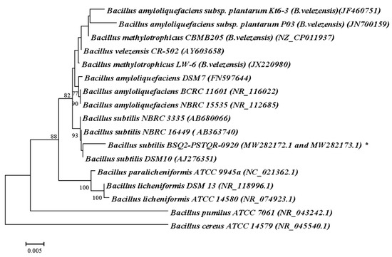 Figure 1. The dendrogram of the genetic similarity between strain BAQ7-PSTQR-0920 and various representatives of the Bacillus genus constructed on the basis of 16S rRNA gene sequences using the Neighbor-Joining method and Kimura’s 2-parameter model. The scale bar indicates 0.005 substitutions per nucleotide position. The analyzed strain is indicated by *.