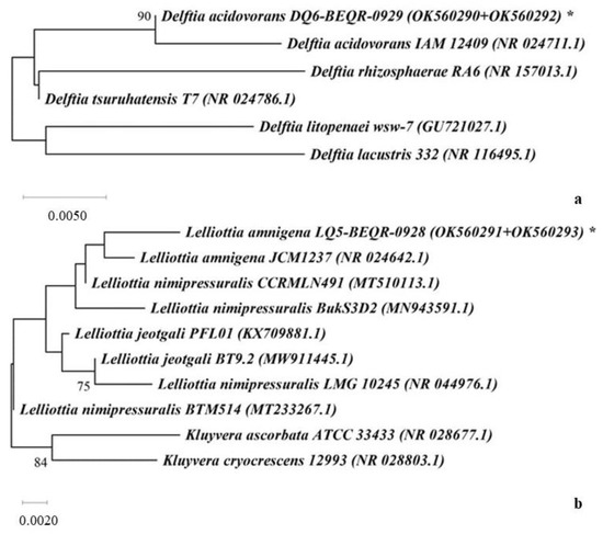 The phylogenetic dendrograms for isolated strains were constructed to clarify species identification and define the genetic relationships with various close relative species (Figure 3). As is shown in Figure 3a, the strain Delftia sp. DQ6-BEQR-0929 and the D. acidovorans type strain formed the group that is separated from the others (the bootstrap value is 90). It confirms that DQ6-BEQR-0929 belongs to D. acidovorans. Figure 3b shows that the strain LQ5-BEQR-0928 together with various strains of L. amnigena and L. nimipressuralis species are combined in a group to which the group of L.jeotgali strains is joined. It suggests high similarity between these species and supposes using additional markers (for example, morphological, biochemical, or genetic markers) to identify bacterial species. Thus, on the basis of a set of morphological, cultural, and genetic characteristics, the strain LQ5-BEQR-0928 was defined as L. amnigena. The 16S rRNA gene sequences were submitted to the GenBank with accession numbers: OK560290.1 and OK560292.1 (D. acidovorans strain DQ6-BEQR-0929) and OK560291.1 and OK560293.1 (L. amnigena strain LQ5-BEQR-0928).