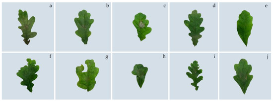 Figure 4. Inoculated leaves of annual oak plants by endophytes, epiphytic and pathogenic: (a)—control, (b)—Pectobacterium spp., (c)—Pseudomonas spp., (d)—Bacillus subtilis (Q2), (e)—Bacillus amyloliquefaciens (Q7), (f)—Q2/Q7 (mix 1:1), (g)—Lelliottia amnigena (Q5), (h)—Delftia acidovorans (Q6), (i)—EpQ1, (j)—EpQ2.