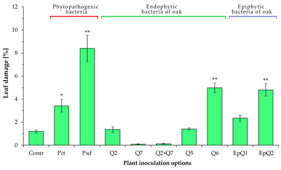 Figure 5. The degree of damage to the leaf surfaces of one-year-old oak seedlings one month after inoculation with bacterial isolates; the data were compared using Tukey’s test (HSD) by one-way ANOVA: *—significant differences to the Control at the level p < 0.05; **—at the level p < 0.01.