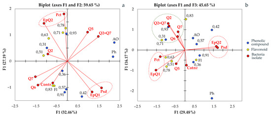 Analysis of the profiling results of phenolic complexes in the leaves of common oak seedlings by the method of principal components confirmed that the studied bacteria are grouped into separate classes according to the nature of their effect on the plant organism after inoculation. Therefore, the index of the ratio of the phenolic antioxidants activity to the total phenols (AAi/Phi) can be an informative marker that allows distinguishing PGPB itself from other groups of endophytes in plant-microbial systems. Thus, for epiphytes, these indicators were close to phytopathogens: EpQ1 was 1.02 and EpQ2 was 0.96. For endophytes with pectinase activity (Q5 and Q6), they were 0.86 and 1.20, respectively. Based on this indicator, two species can be assigned to the PGPB class from the selected endophytes to some extent: the B. subtilis strain BSQ2-PSTQR-0920 and the B. amyloliquefaciens strain BAQ7-PSTQR-0920. Close to them is D. acidovorans DQ6-BEQR-0929. Analysis of the results of profiling of phenolic complexes in the leaves of common oak seedlings by the method of principal component analysis confirmed that the studied bacteria were grouped into separate classes according to the nature of their effect on the plant organism after inoculation. Potential PGPB in the coordinates of the components F1 and F2 (Figure 6a) and F1 and F3 (Figure 6b) were close to each other as well as to the control plants.