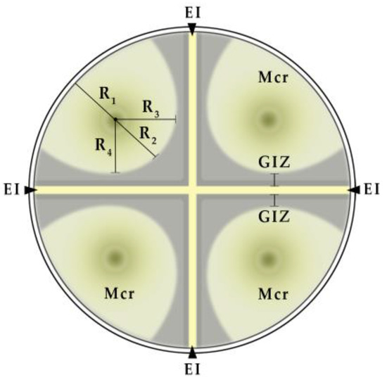 Figure 7. Scheme for evaluating the antifungal activity of endophytic bacteria based on indicators of linear growth of micromycete colonies: EI—endophytic isolate; GIZ—growth inhibition zone; Mcr—micromycete; R1–R4—micromycete colony radii.