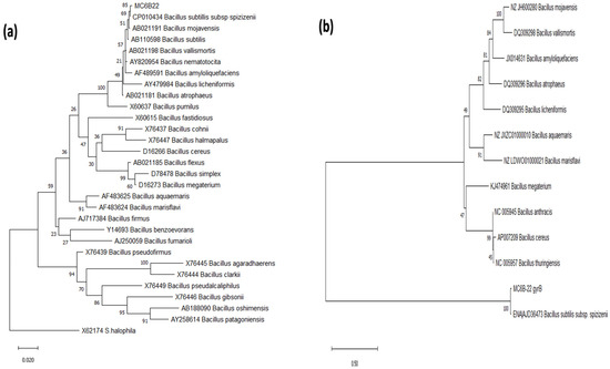 - Rooney, A.P.; Price, N.P.J.; Ehrhardt, C.; Swezey, J.L.; Bannan, J.D. Phylogeny and molecular taxonomy of the Bacillus subtilis species complex and description of Bacillus subtilis subsp. inaquosorum subsp. nov. Int. J. Syst. Evol. Microbiol. 2009, 59, 2429–2436. [Google Scholar] [CrossRef]