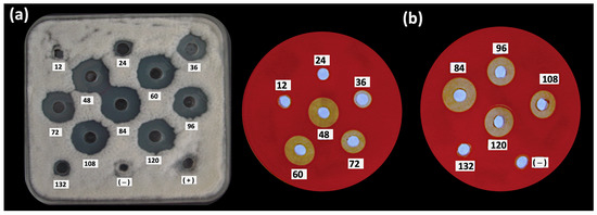 Into the first TLC plate, saline (0.85%) and agar (1%) mixed with sheep blood (5%) were poured slowly under aseptic conditions. The agar layer was allowed to solidify and the plate was incubated at 25 °C for 24 h. The presence of areas of hemolysis in the plates was verified. For antifungal activity, molten soft PDA (1.0% agar) was poured onto a plate and inoculated with 1 × 105 conidia/mL of C. gloeosporioides (ATCC 42374) on TLC. The plate was incubated at 28 °C and the mycelium’s growth and the inhibition zones were verified after 48 h. The bioautography was stained with a 2,3,5-triphenyl tetrazolium chloride (TTC, Sigma Aldrich) to observe fungal growth inhibition. Fungal growth reduces tetrazolium compounds to a deep red color from formazan derivatives. The zones of hemolysis and inhibition were used to calculate the retention factor (Rf).
