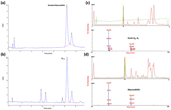 Characterization of lipopeptide for (a) HPLC standard mycosubtilin, (b) 84 h purified lipopeptide analysis (PL84); MALDI–TOF-MS analysis of (c) iturin A6, A7 and (d) mycosubtilin.