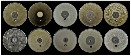 Antifungal activity of CL84 by agar well diffusion showing broad spectrum against different phytopathogens (a) Aschochyta sp., (b) Colletorichum acutatum, (c) Colletotrichum gloeosporioides ATCC 42374, (d) Colletotrichum gloeosporioides, (e) Colletotrichum capsici, (f) Curvularia clavata, (g) Fusarium nivale, (h) Fusarium solani, (i) Moniliophthora roreri, (j) Pestalotiopsis maculans.