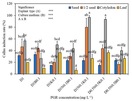 Effect of plant growth regulators on callus induction seed, half seed, cotyledon, and leaf explants of S. thea on MS medium containing 2,4-D, NAA, BA, and KN after 4 weeks of culture. Mean values with different alphabetical letters denote significant differences between the values according to Tukey’s test at p ≤ 0.05. *** Explants (A) and culture medium (B) effects are statistically significant at p ≤ 0.05.