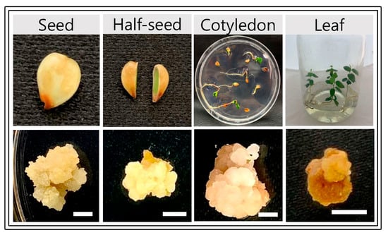 Callus induced from seed, half seed, cotyledon, and leaf explants of S. thea on MS medium containing 2,4-D, NAA, BA, and KN after 4 weeks of culture. Scale bars = 1 cm.