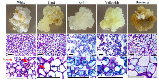 Morphological and histological features of callus regenerated from different explants of S. thea. Scale bar = 100 µm. Red arrows indicate starch grains.