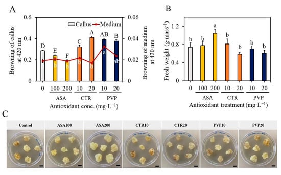 Morphological features of callus after treatment with 100, 200 mg L−1 ascorbic acid (ASA) or 10, 20 mg L−1 citric acid (CTR) or 10, 20 mg L−1 polyvinyl pyrrolidone (PVP). (A) Shows the absorbance of cell extract at 420 nm on a spectrophotometer, (B) shows the fresh weight of the callus, and (C) the morphology of the callus with different treatments. Different letters indicate mean values which are significantly different at p ≤ 0.05 according to Tukey’s test.