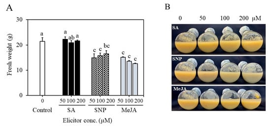 Effect of elicitor treatments on biomass accumulation in cell suspension cultures (A). Biomass growth with the increment of elicitor concentrations compared to control (B). SA—salicylic acid, SNP—sodium nitroprusside, MeJA—methyl jasmonate. Different letters indicate mean values which are significantly different at p ≤ 0.05 according to Tukey’s test.
