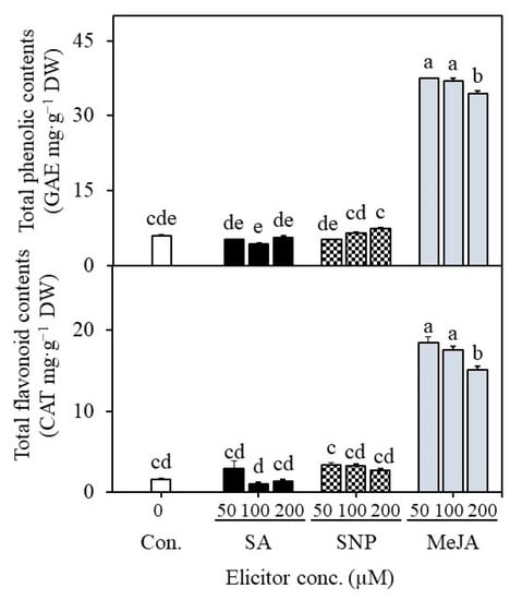 Effect of elicitor treatments on the accumulation of total phenolics and flavonoids in cell suspension cultures. SA—salicylic acid, SNP—sodium nitroprusside, MeJA—methyl jasmonate. Different letters indicate mean values which are significantly different at p ≤ 0.05 according to Tukey’s test.