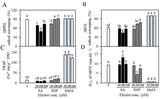 Effect of elicitor treatments on antioxidant activity in cell suspension cultures. SA—salicylic acid, SNP—sodium nitroprusside, MeJA—methyl jasmonate. Effect of elicitors on DPPH radical scavenging activity (A), ABTS radical scavenging activity (B), FRAP assay (C), and IC50 values of ABTS activity (D). Different letters indicate mean values which are significantly different at p ≤ 0.05 according to Tukey’s test.