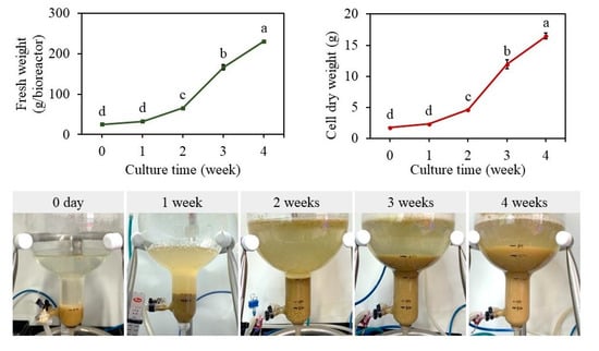 Cell suspension cultures in balloon-type bubble bioreactors: accumulation of fresh biomass, dry biomass over four weeks of culture Different letters indicate mean values which are significantly different at p ≤ 0.05 according to Tukey’s test.