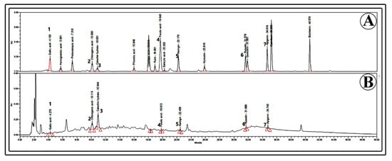 HPLC chromatograms of phenolic compounds. (A) Standards, (B) gallic acid (1), chlorogenic acid (2), catechin hydrate (3), ferulic acid (4), naringin (5), luteolin (6), and apigenin (7).