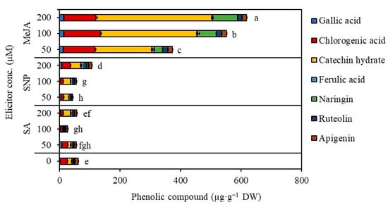Quantity of phenolic compounds accumulated in cell suspension cultures with elicitor treatments. SA—salicylic acid, SNP—sodium nitroprusside, MeJA—methyl jasmonate. Different letters indicate mean values which are significantly different at p ≤ 0.05 according to Tukey’s test.