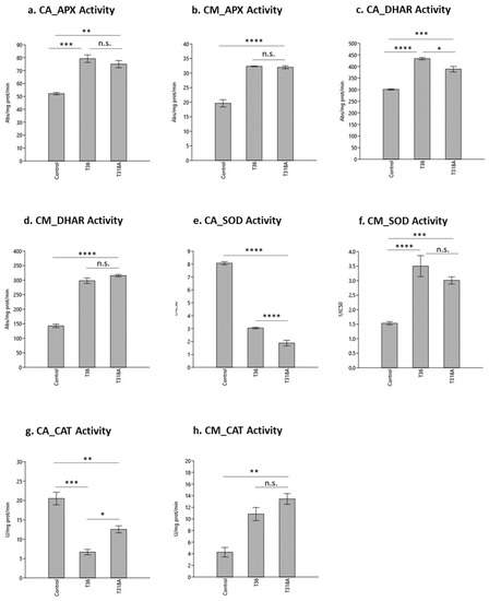 Activity of antioxidant enzymes in the phloem sap of sour orange and alemow, healthy and infected with CTV T36 isolate or T318A. Comparisons were made between control and infected samples and between the infected samples. (a) ascorbate peroxidase (APX) activity in CA; (b) APX activity in CM; (c) dehydroascorbate reductase (DHAR) activity in CA; (d) DHAR activity in CM; (e) superoxide dismutase (SOD) activity in CA 1/IC50; (f) SOD activity in CM 1/IC50; (g) catalase (CAT) activity in CA; (h) CAT activity in CM. ****: p < 0.0001; ***: p < 0.001; **: p < 0.01; *: p < 0.05; n.s.: not significant (p > 0.05).