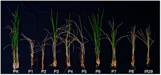 Salt tolerance of the 8 parents by 14 days under 0.7% NaCl stress at the seedling stage. PK: Pokkali (Tolerance check), IR29 (Susceptible check), P1–P8: eight parents.