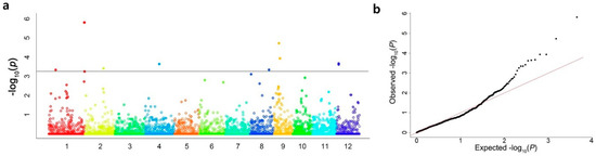 GWAS for salt tolerance at the seedling stage in the japonica-MAGIC population. Manhattan plot (a) and quantile-quantile plot (b) for the GWAS in the japonica-MAGIC population using the MLM. The horizontal line indicates the threshold value (p = 5.0 × 10−4).