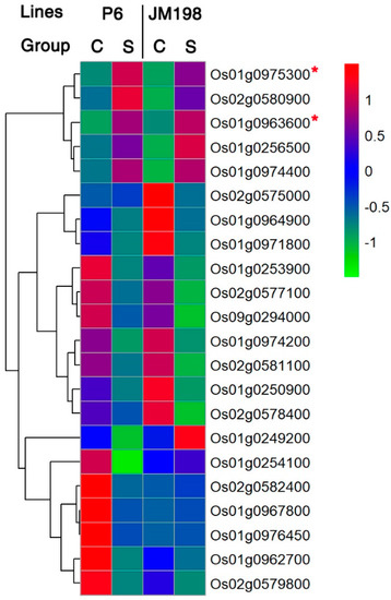 Gene expression analysis of 22 candidate genes related to salt tolerance between P6 and JM198. C: control group, S: salt stress group, *: Commonly upregulated DEGs in both P6 and JM198 located in the target regions of qDTS1-2.