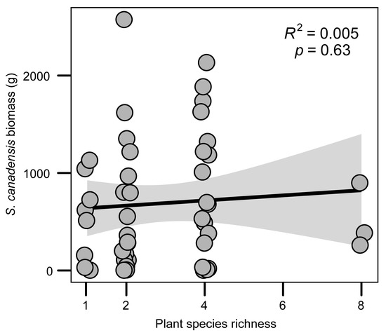 The biomass of the invader did not decrease with native plant species richness (R2 = 0.005, p = 0.63, Figure 1). Considering that there were three replicates at the level of native plant species richness of 8, we checked the statistical significance without this plant species richness level. This did not significantly increase with native plant species richness (R2 = 0.038, p = 0.21, Figure S2).