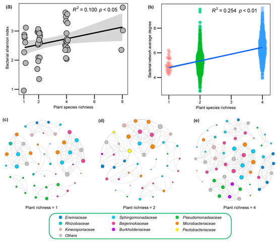 Alpha diversity and network complexity of leaf bacteria community of the invader along the native plant species richness gradient. (a) The relationship between bacterial alpha diversity and native plant species richness. (b) The relationship between bacterial network complexity and native plant species richness. (c–e) The selected presentative networks at three plant species richness levels. Node size is weighted by the number of its edges in each network. Nodes are colored based on their families. Others include unclassified taxa or those with low abundance in networks. As less than the minimum number of samples are used in constructing the network, the network complexity of the 8-species treatment is not calculated.