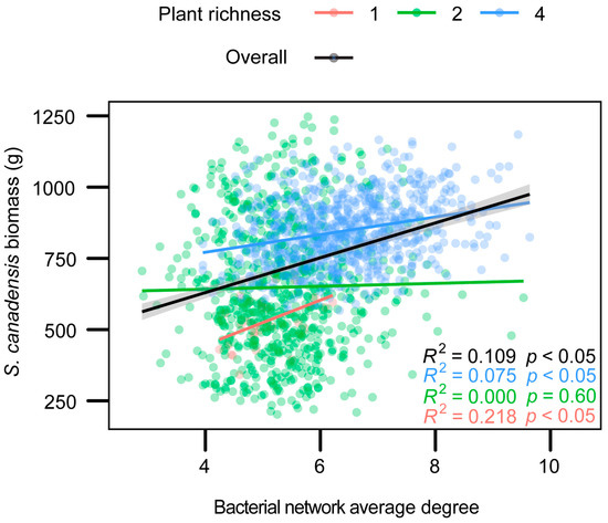 In our study, community invasibility was assessed by the biomass of S. canadensis, i.e., a higher biomass of S. canadensis suggested a stronger invasion of the local plant community. Leaf bacterial alpha diversity was estimated by its Shannon diversity using the vegan package in R v4.1.2 [74]. The average degree (the average number of edges per node) was calculated as a proxy for the complexity of the bacterial network, which reflected the extent of interactions between bacterial species. Networks were constructed from Pearson correlations using the igraph package in R, in which correlations were considered when the absolute value of Pearson’s r > 0.8 and p < 0.05. Considering the different replicates at different plant species richness levels and the minimum number of samples to construct the bacterial network, we used 6 samples, each time, at each plant species richness level. For the single-species treatment, all sample combinations (6 samples per combination) from 8 samples were selected, including 28 unique networks. For 2-species and 4-species treatments, each sample was chosen from each plant combination (6 plant combinations in total), including 729 unique networks. Since it was less than the minimum number of samples constructing the network, the network complexity of the 8-species treatment was not calculated. Then, we manually selected the closest representative network to the average level at the same plant species richness level. All correlations were analyzed by linear regression.