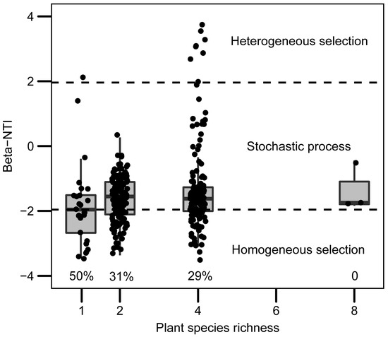 Distribution of beta-NTI values along native plant species richness gradient. Dash lines at beta-NTI = −1.96 and beta-NTI = 1.96 denote thresholds for the assembly process. The percentage below the box plot represents the proportion of homogenous selection.
