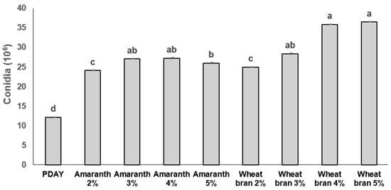 However, the highest conidiation (F = 5.49; df = 24, 50; p < 0.001) was observed after culturing on 4% wheat bran flour (36.9 × 106 conidia/mL), whereas the lowest production was detected on 4% soy extract supplement (12.1 × 106 conidia/mL) (Table 1).