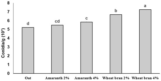 Conidia production on oat plus supplements reached up to 10⁷ conidia/g (Figure 3). The highest conidia production by INIFAP-Hir-2 was observed after culturing on oat with wheat bran after a 14 d incubation period, whereas the lowest one was detected on oat without supplements (5.22 × 10⁷ conidia/g). Furthermore, the highest production was obtained after culturing on oat supplemented with 4% wheat bran (7.25 × 10⁷ conidia/g) (F4,10 = 40.167; p < 0.001) (Figure 3).